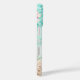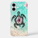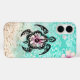 A stylized tribal turtle design with intricate patterns is centred on a turquoise background, surrounded by delicate pink hibiscus flowers. The scene evokes a fun, beachy feel with its blend of nature-inspired elements.