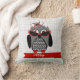 Un coussin comportant une illustration d'un hibou gris et noir avec un ventre de pied-de-poule et des pieds rouges. Le hibou utilise un casquette rouge et noir de fascinator et des lunettes de soleil rouges de plot réflectorisé. Personnalisez avec votre nom. Le bord opposé est pied-de-poule.