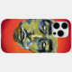 This abstract iPhone case features a striking emotionless face in calming green and blue tones, contrasted against a fiery red and orange background with a radiant yellow highlight. The bold color combination creates a captivating balance between intensity and tranquility, making it a unique statement piece. Perfect for art lovers who appreciate expressive, modern designs.