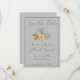 A high class save the date, this card is illustrated using a beautiful blue background. Utilizing a blue and brown colour scheme this save the date features a brown frame and brown text. "Save the Date" is written at the top in lovely brown cursive font. Underneath is a peach and blue floral graphic. Underneath are templates for inserting wedding information. Customize your Save the Date cards today!