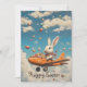 Elevate your holiday greetings with this whimsical illustration of a white bunny piloting an orange carrot-themed plane through a cloud-filled sky. The front captures the pilot bunny in a red scarf, soaring as colourful Easter eggs rain down from the heavens. The back of the card remains fully customizable for your event details at "Carrot Road," making it a soaring success for family brunch invitations.