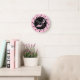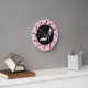 This clock for fashion fans has shoes printed on it in a pink and black colour scheme.