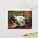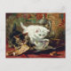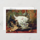 A fine art postcard with the painting, High Tea (unknown date), by the Dutch-Belgian artist Henriëtte Ronner-Knip (1821-1909). A white cat sipping from a teacup with a silver tea set in the background. She created numerous paintings featuring dogs and cats in the Romanticist style.