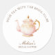 Elegant bridal shower round sticker featuring a pastel teapot illustration with gold accents paired with serif and script fonts in which your personalized information is written in. Check out our store for more items from this collection.