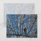 A photograph of an American Robin looking up whilst it's perched on a tree branch. The tree branches give an abstract look with white and grey lines streaking all over the blue sky background. Image Copyright ©2021 Kimberly J Tilley.