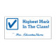 This encouraging rubber stamp design features the praise message "Highest Mark In The Class!" and a personalized teacher's name. It also features a decorative checkmark icon. It could be used by a teacher, educator, instructor, or tutor when marking assignments, to acknowledge that the student has done well.