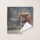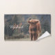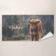 Highland cow calf autumn grass field photograph. Stunning young calf of highland scottish cattle on an autumn grassy field with muted colours. Beautiful dark hairy orange coat contrasting with light yellow green grass and trees in bokeh in background. Custom personalizable monogram with your name and inital on the left.