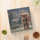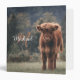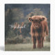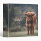 Highland cow calf autumn grass field photograph. Stunning young calf of highland scottish cattle on an autumn grassy field with muted colours. Beautiful dark hairy orange coat contrasting with light yellow green grass and trees in bokeh in background. Custom personalizable monogram with your name and inital on the left.