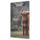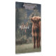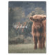 Highland cow calf autumn grass field photograph. Stunning young calf of highland scottish cattle on an autumn grassy field with muted colours. Beautiful dark hairy orange coat contrasting with light yellow green grass and trees in bokeh in background. Custom personalizable monogram with your name and inital on the left.
