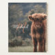Highland cow calf autumn grass field photograph. Stunning young calf of highland scottish cattle on an autumn grassy field with muted colours. Beautiful dark hairy orange coat contrasting with light yellow green grass and trees in bokeh in background. Custom personalizable monogram with your name and inital on the left.