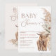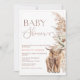 Bohemian inspired baby shower invitation featuring a highland cow and calf, an earthy colored floral arrangement with pampas grass on the right hand side of the invitation and a modern serif and calligraphy image heading in a faux gold foil texture. Ideal for anyone having a cow themed and bohemian inspired baby shower.