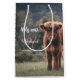 Highland cow calf monogram first birthday party. Stunning young calf of highland scottish cattle on an autumn grassy field with muted colours. Beautiful dark hairy orange coat contrasting with light yellow green grass and trees in bokeh in background. Custom personalizable monogram with your name and initial on the left. Everything for the first birthday of your child, invitations, paper plates, cups and more.