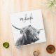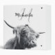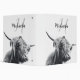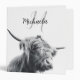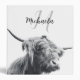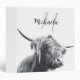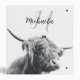Highland cow portrait custom name initial monogram in black and white. Portrait photograph of a majestic highland cattle on a foggy day with white background in black and white.