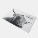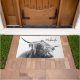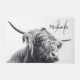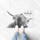 Highland cow portrait custom name initial monogram in black and white. Portrait photograph of a majestic highland cattle on a foggy day with white background in black and white.