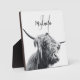 Highland cow portrait custom name initial monogram in black and white. Portrait photograph of a majestic highland cattle on a foggy day with white background in black and white.
