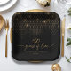 This elegant paper plate is part of a sophisticated collection, featuring luxurious geometric backgrounds and intricate, shimmering gold details. This classic design exudes a glamourous charm, with a colour palette of black and glowing gold tones. Your name and anniversary date are proudly displayed with the expression '50 years of love'. Search ID1165 to see other products in this design set.