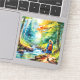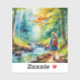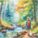 This is a watercolor image of a girl hiking next to a stream in a forest. It has beautiful colours and would look great setting on a desk or anywhere you like. Just looking at it helps me feel more at ease.