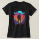 A cool retro style colourful mountain landscape design featuring a hiker in the sunset.