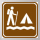 International style road and highway sign advising of recreational facilities, specifically: hiking trails with lakeside camping.