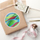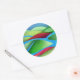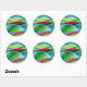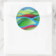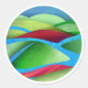 An abstract landscape with vibrant colours and textures showing hills floating on ice in shades of green, blue, cyan, red, and pink.