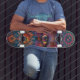 This colourful skateboard design features a Hindu-style mystic entity with a seeing eye.