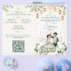 Green and gold flowers garlands and lanterns cute bridal couple caricature Indian wedding program