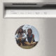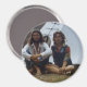L'artiste et sa mère sont assis devant son tipi sur cet aimant rond.
