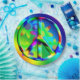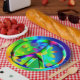 A graphic design of a rainbow flower power peace sign by artist/designer Charmaine Paulson on a party plate.