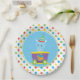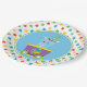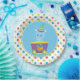 This party plate features a blue background surrounded by a repeating patter of red, blue, yellow and green stars. A cute baby hippo (hippopotamus) wearing a party hat in a purple train car sits in the middle of the plate.