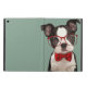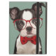 Cute illustration of a hipster style boston terrier puppy wearing eye glasses and chic red bow tie on blue background. Designed by Maryline Cazenave.