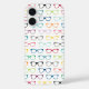 A colourful and cute iPhone 16 case with a nerdy hipster eye glasses pattern on a white background. Featuring yellow, orange, red, purple, blue, and mint green eyeglasses. Perfect for optometrists, book lovers, geeks and more!