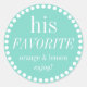 A simple sticker for wedding favours with "His favourite" written in white on a simple aqua blue background with a white polka dot border.