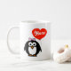 His and hers penguin mugs | matching set. Cute home decor for just married newly weds / husband and wife couple. Romantic gift idea for newlyweds / bride and groom. Also fun for wedding anniversary. Custom background colour behind red heart. Double sided design. Cute animal bird cartoon with red heart balloon.