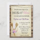 Rustic Couples Bridals shower invitation features a barn wood background, wood kitchen utensils wrapped with flowers and hanging lights.