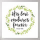 Elegant Brush Script Typography Design with hand drawn laurel greenery wreath in green and tan features words from the beloved scripture in Psalm 118:1, "His Love endures forever."