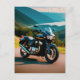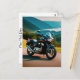 This postcard features a motorcycle against a stunning natural background.