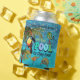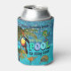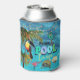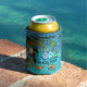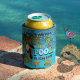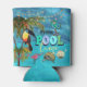 Create a tropical vibe with this cool CAN COOLER featuring A Palm tree, toucan, birds, turtle crystal clear turquoise water, string lights, and the text "Hit the pool to stay cool".