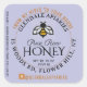 Personalize this honey label with your apiary name, street or owner name & location, net weight. "Pure Raw" is written in a script font and "Honey" in an elegant capitalized font beneath a catchy-looking "windowpane" honeybee. Facebook handle and infant warning.