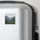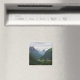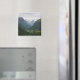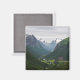 Souvenir photo magnet of a landscape with a curvy road into green Hjelle valley surrounded by high mountains in Norway.