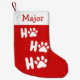 Personalize this festive Ho Ho Ho, red and white Christmas stocking for your dog! The custom Ho, Ho, Ho text has dog paw prints for the letter "O" in white. You can change the typeface style for the letter "H", adjust the size of every motif, move elements around, and choose a different background colour. The reverse side of this dog stocking has a red background and white cuff colour block. This fun and unique Christmas stocking is perfect for any dog!