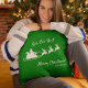 Add a fun seasonal touch to your home with this custom green and white throw pillow. Throw pillow features green background with white Merry Christmas greeting and Ho Ho Ho text, your family last name, and Santa Claus flying in his sleigh with reindeer.