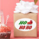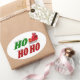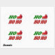 Stickers with ho ho ho in 3D green and red text and Santa's sleigh. Stickers are available in several shapes.