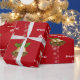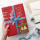 Modern, funny, and cute Christmas wrapping paper, with an image of a unicorn pulling Santa's sleigh (full of gifts), the texts "Ho ho hoh dear, what a YEAR!" + "Here's to a happier one!" + "Merry Christmas!" and a personalized name. With sprinkles of white and silver snowflakes, and a pair of Xmas bells and a red ribbon, each with a spring of holly, on a Xmas red background.