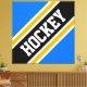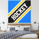 This sporty bold design features athletic HOCKEY text inside a highlighted wide diagonal black, white, and golden yellow racing stripes against bright blue outer stripes. The text in this design can be personalized.