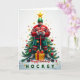 This card shows a hockey player turning into a Christmas tree! 🎄 He wears a green helmet and a red-and-white jersey, and holds a red hockey stick. On his legs are shiny Christmas decorations and a golden star on his head. He's on a white background, looking confident and festive. The colors are red, green, gold, and black, giving a warm holiday feeling.