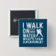 Hockey player button with a humourous saying features white text on a blue background and a white silhouette hockey player. The text on this hockey player bag reads I Walk on Water What's Your Superpower?