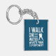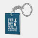 Hockey player keychain with a humourous saying features white text on a blue background and a white silhouette hockey player. The text on this hockey player keychain reads I Walk on Water What's Your Superpower?