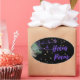A perfect Happy Halloween Hocus Pocus gift label or sticker designed with vibrant violet lettering and smoky stars on a black background.