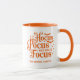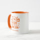 "Hocus pocus, I need wine to focus (or strong coffee)" saying printed in orange on both sides of a coffee cup, fun for Halloween for women or men.