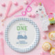 First birthday golf theme "Hole in One " with gold cart and light blue chequered plaid pattern.